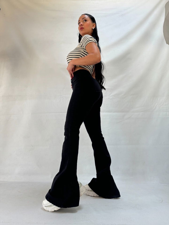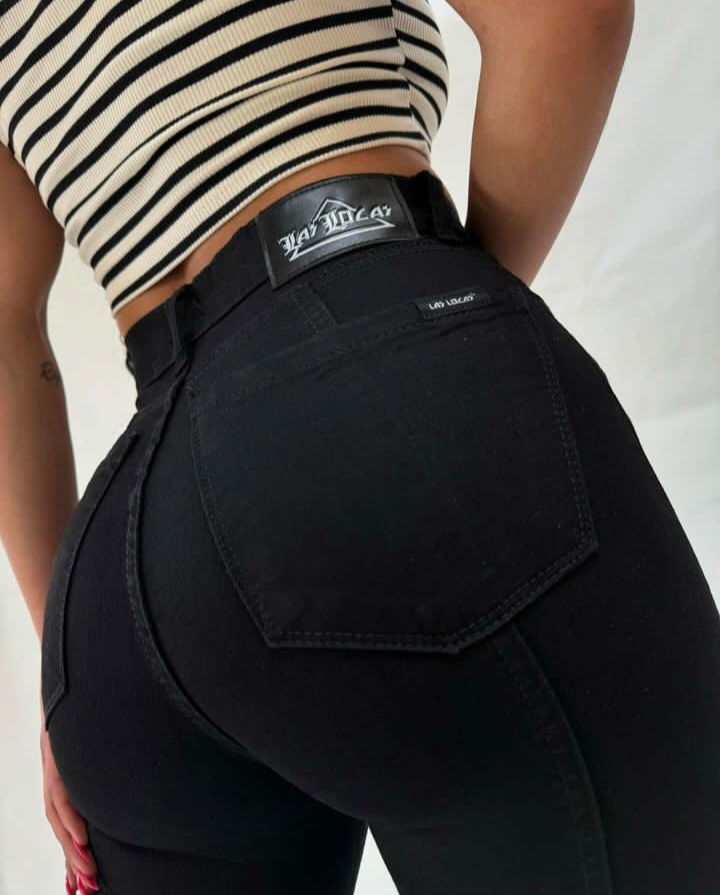 Tiro alto, elastizado. Con abertura atrás en botamangas. Marca las locas original.