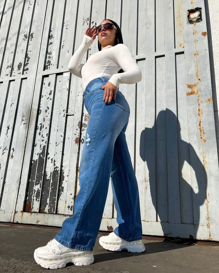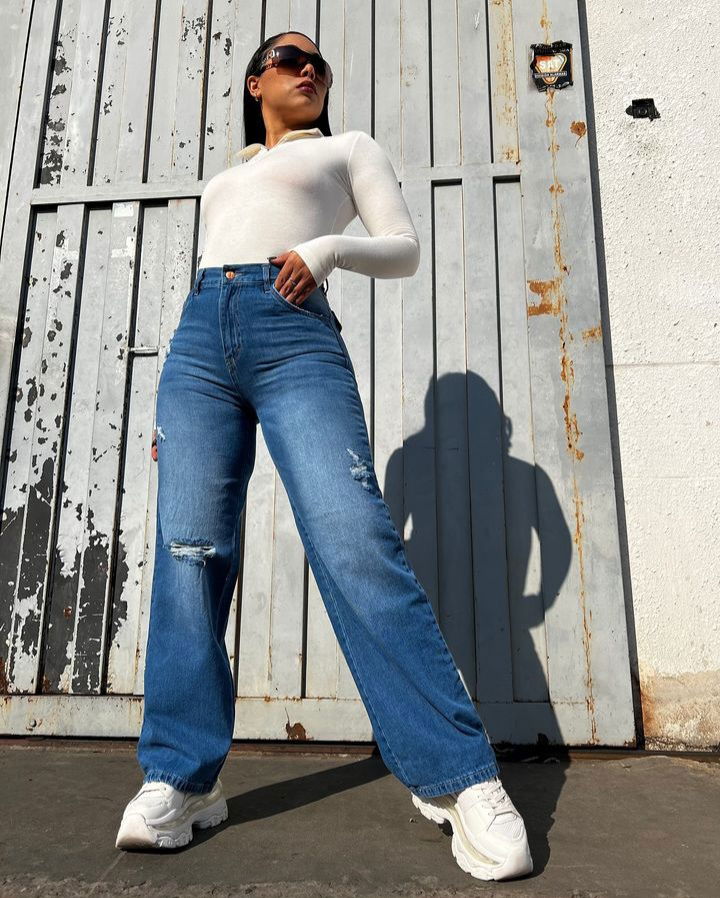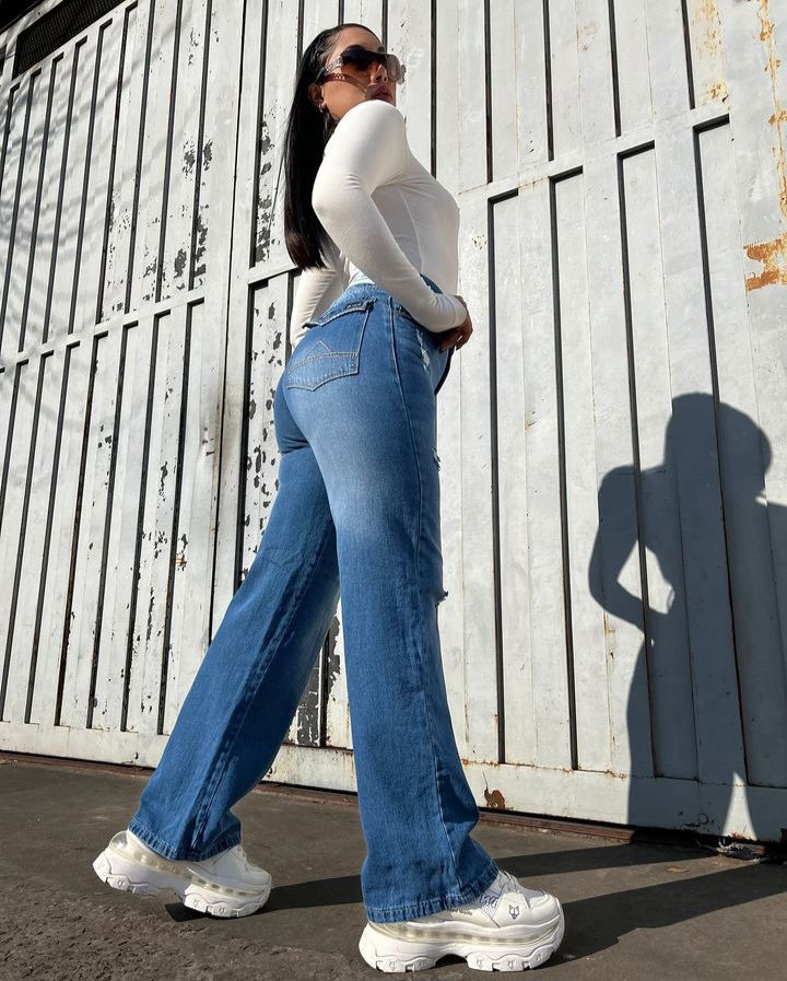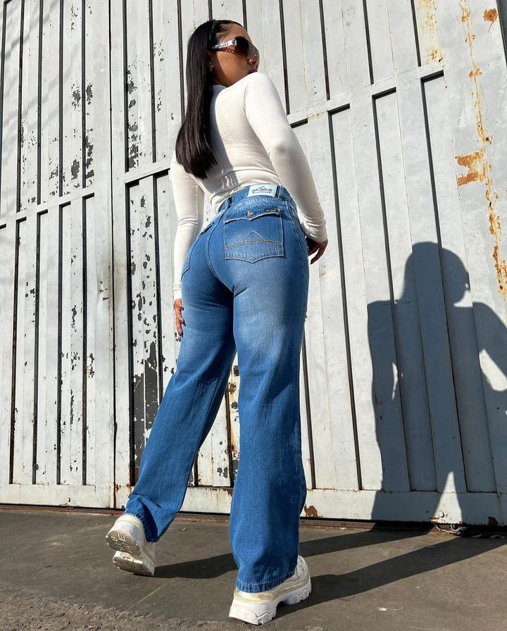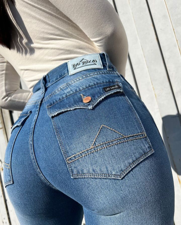 Tiro alto, rígido. Con roturas y bolsillos con botones. Marca las locas original.