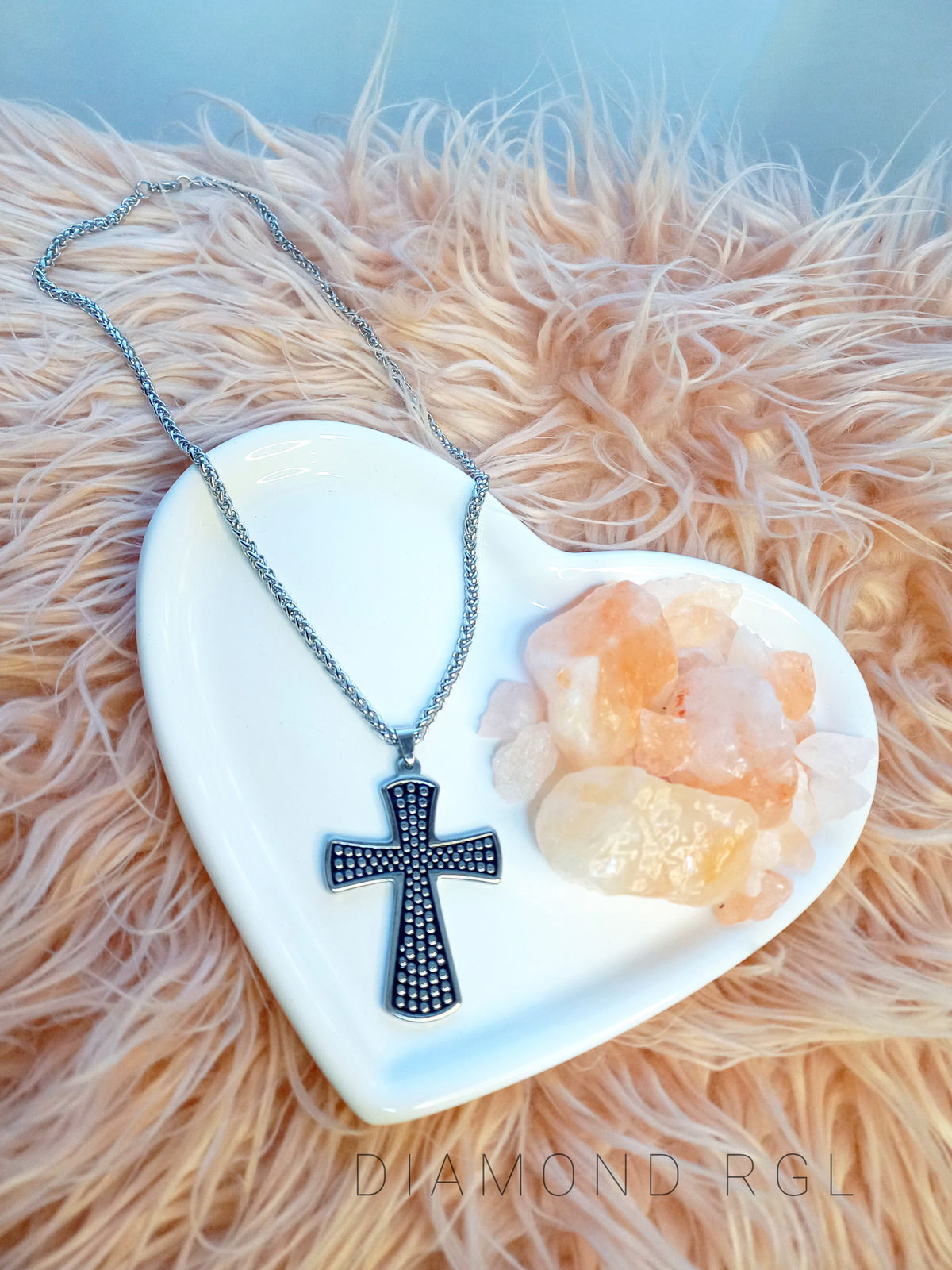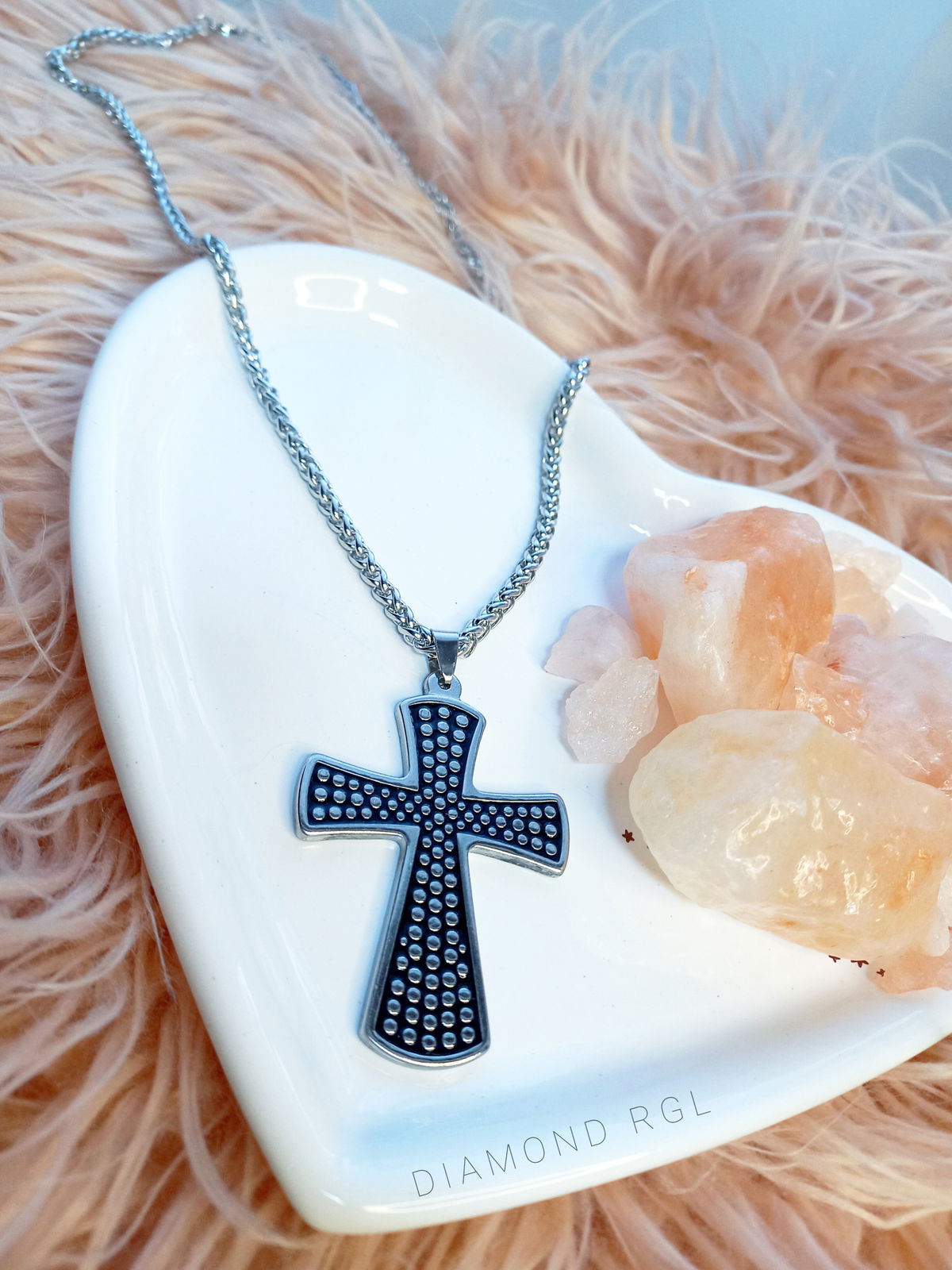 De acero quirúrgico. Cadena espiga 4mm, 50cm. Con dije cruz esmaltado 7cm.