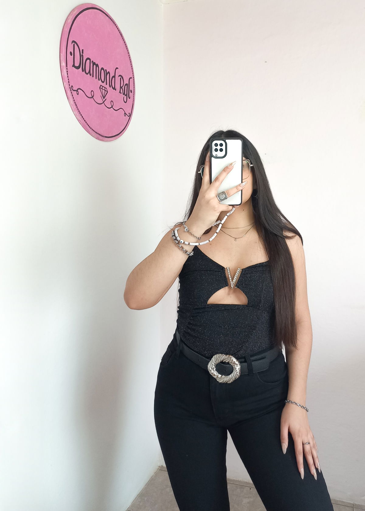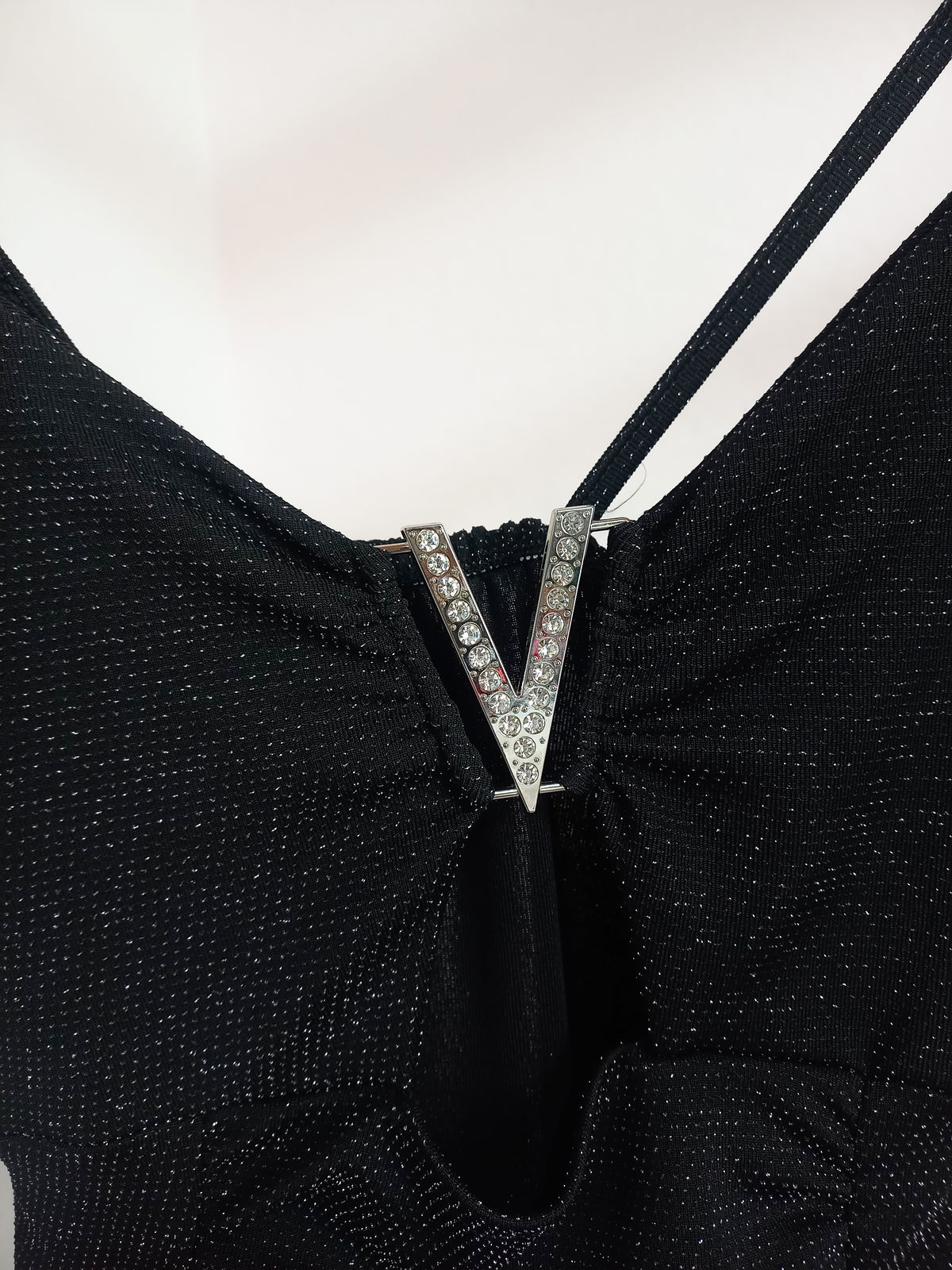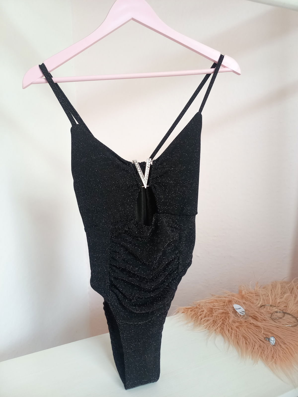 De microfibra con glitter. Enterizo. Detalle de hebilla con strass. Tiene elástico atrás. Talle único abarca hasta un M.